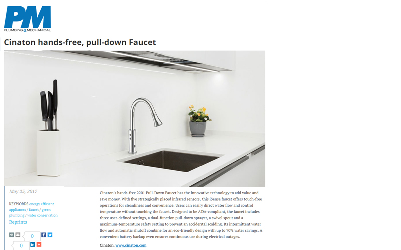 Cinaton?s hands-free 2201 Pull-Down Faucet has the innovative technology to add value and save money. With five strategically placed infrared sensors, this iSense faucet offers touch-free operations for cleanliness and convenience. Users can easily direct water flow and control temperature without touching the faucet. Designed to be ADA-compliant, the faucet includes three user-defined settings, a dual-function pull-down sprayer, a swivel spout and a maximum-temperature safety setting to prevent an accidental scalding. Its intermittent water flow and automatic shutoff combine for an eco-friendly design with up to 70% water savings. A convenient battery backup even ensures continuous use during electrical outages.
